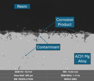 💡 I learned this the hard way. Below is an image of an AZ31 magnesium alloy sample after immersion in phosphate-buffered saline (PBS). Its cross-section was carefully prepared by grinding and polishing. However, during the final step, after ultrasonic cleaning in ethanol, the sample was dried using standard lab air. The result? Numerous undefined dark patches appeared on the surface. These artefacts likely resulted from contaminants or residual moisture introduced during the air blow.