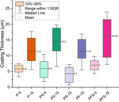 Figure 2. Boxplot representation of post-production coating thicknesses for samples with different coating thicknesses.