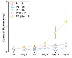 Şekil 4. Farklı numuneler arasında korozyonun hızının zamana bağlı değişimini gösteren line grafiği. [1]