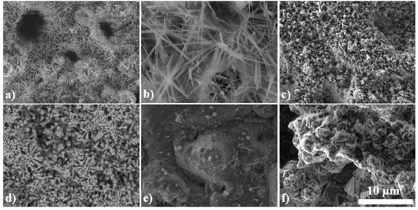 Şekil 5. Korozyon testinden sonra SEM ile gözlemlenen farklı morfolojilere sahip bölgeler.