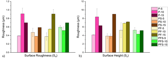 Şekil 9. Farklı kalınlıklarda kaplamalara ve içeriğe sahip numunelerin (a) yüzey pürüzlülüğü ve (b) yüzey yüksekliği [1].